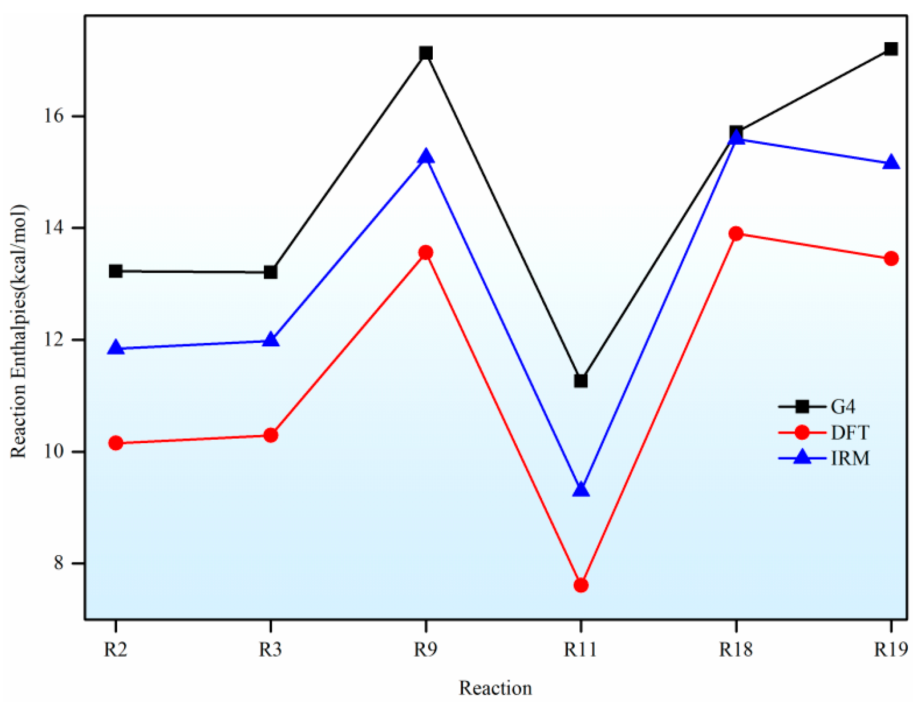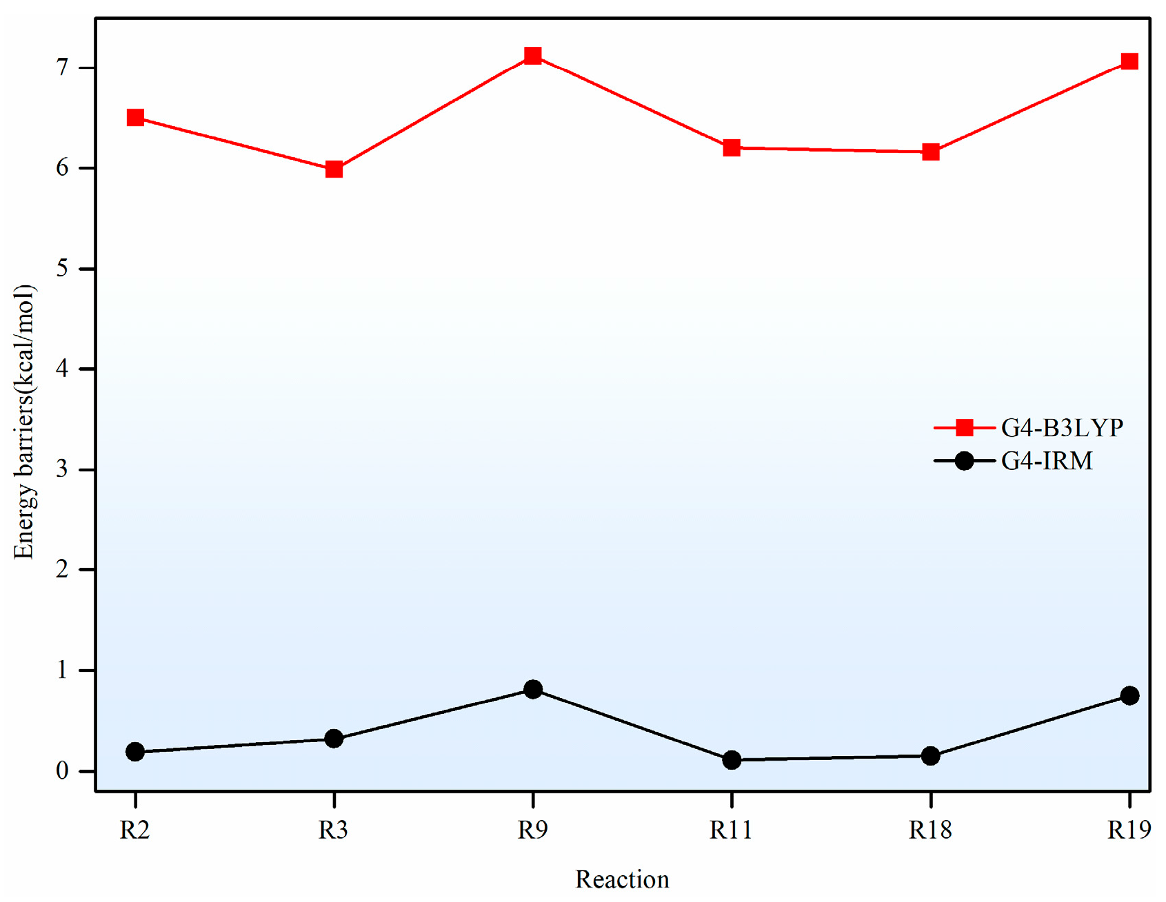 a Energy barriers derived from the B3LYP method after correction via the isodesmic reaction method (IRM). * The values in parentheses are the deviations of the energy barriers between the G4 method and the B3LYP method. # The values in parentheses are the deviations of the energy barriers between the G4 method and the isodesmic reaction method (IRM).