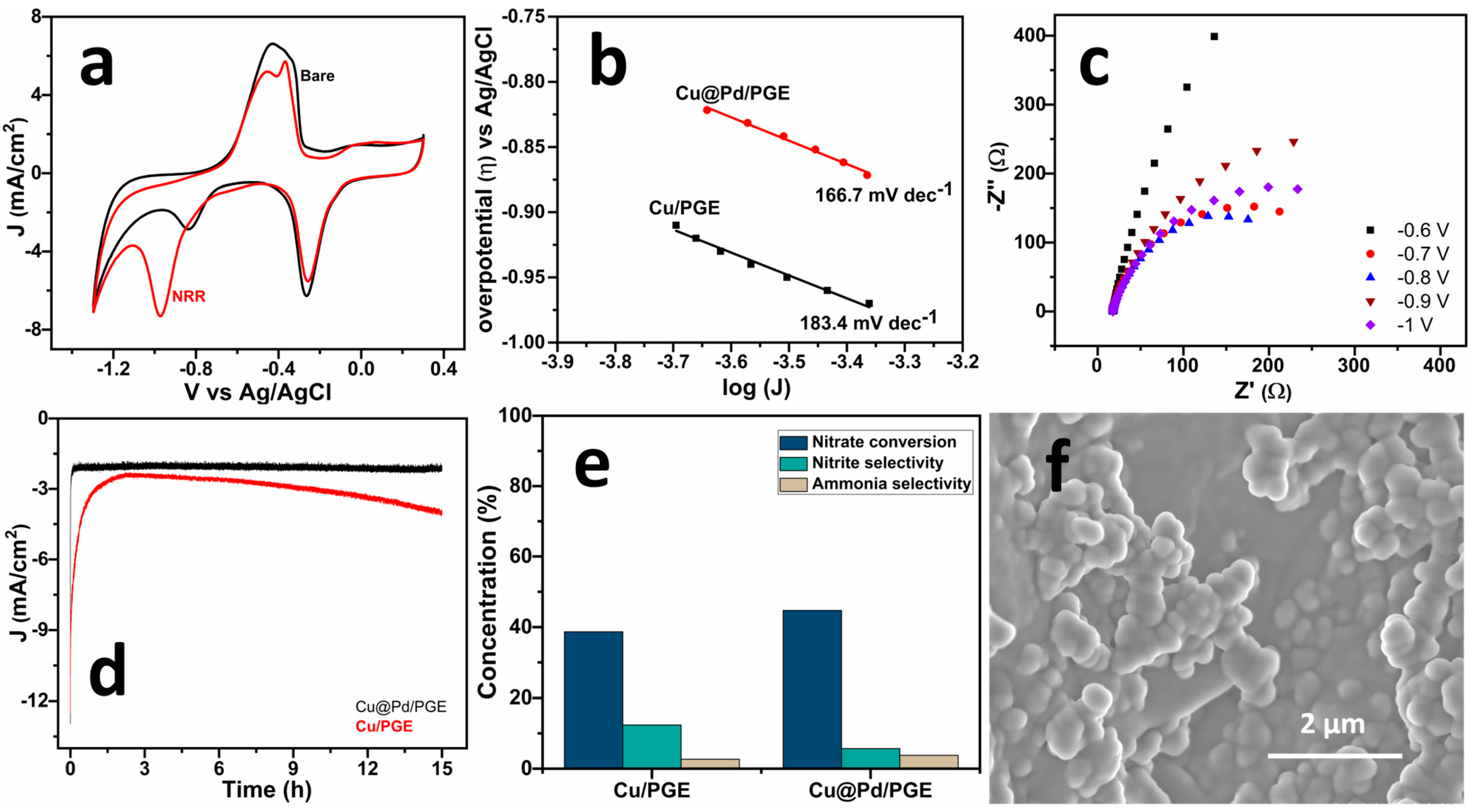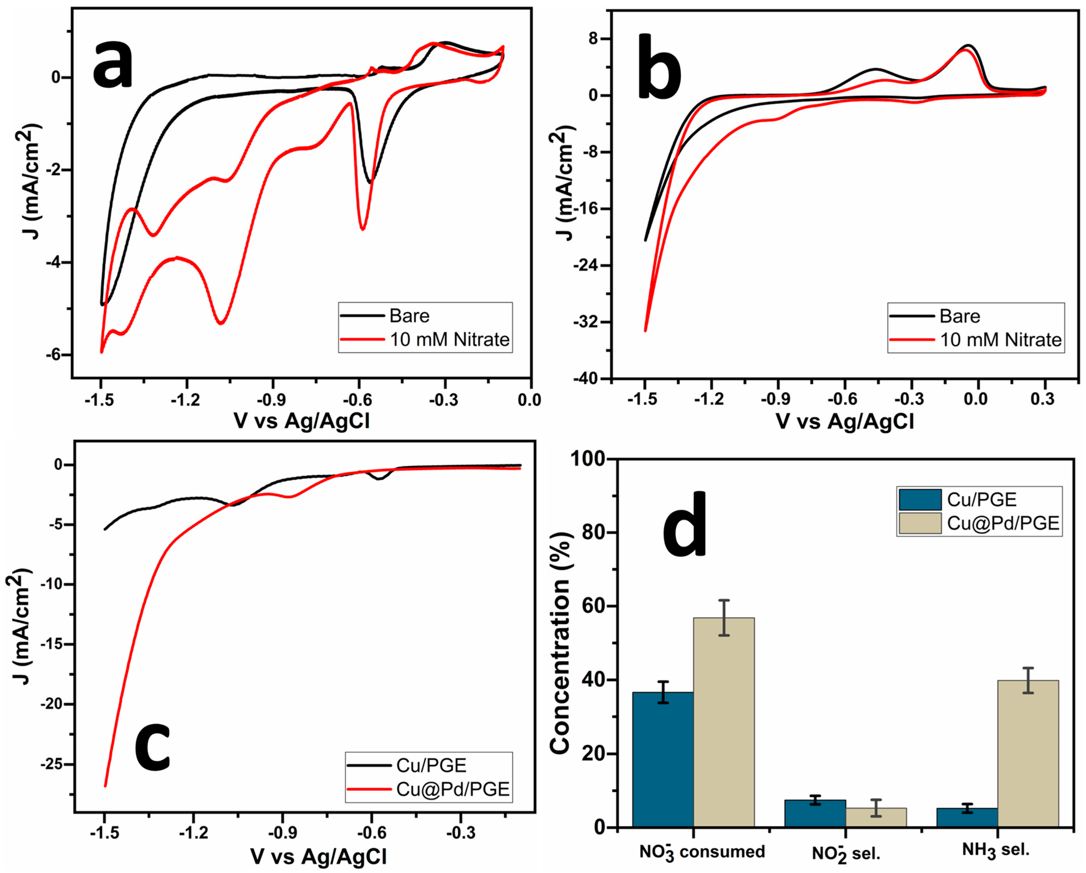 Cu@Pd/PGE | Electrodeposition | 10 mM in 0.1 M KOH | Nitrate removal of 46% at −1.0 V | This work |
