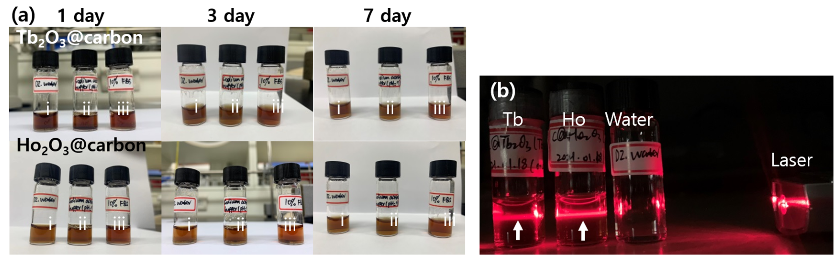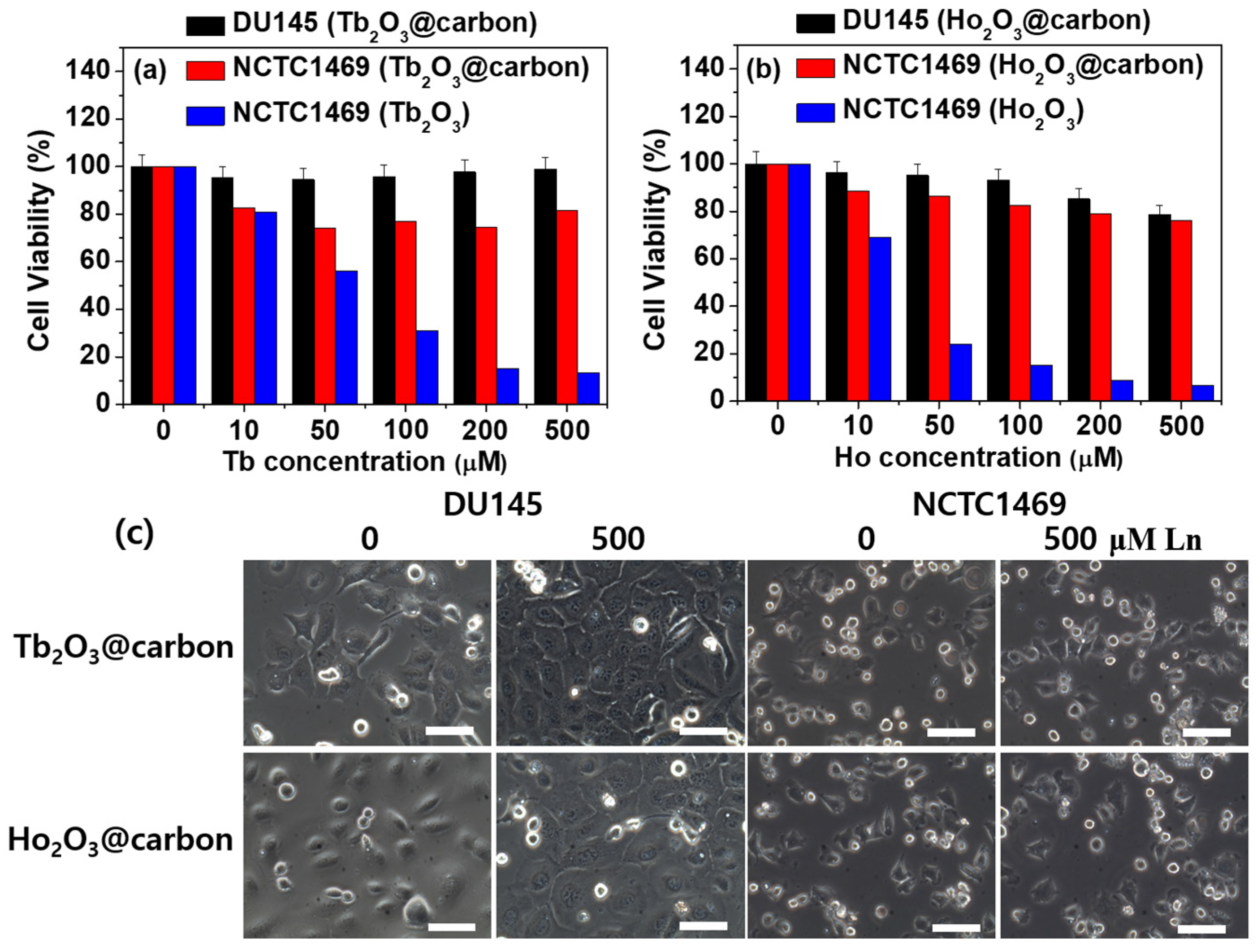 - The ultrasmall core–shell Ln2O3@carbon nanoparticles (Ln = Tb and Ho) showed nearly monodisperse size distributions (davg = ~3 nm), along with good colloidal stability and low cellular cytotoxicity.
