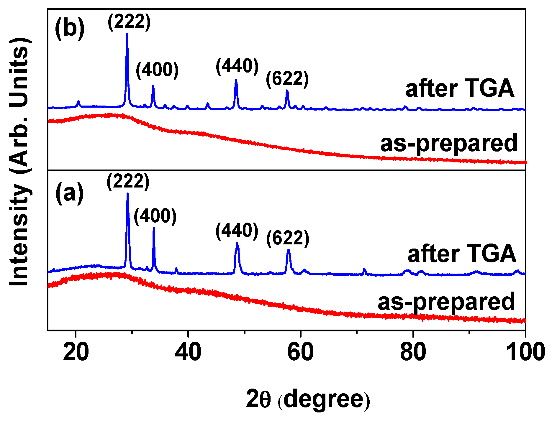 4.2. Synthesis of Ultrasmall Core–Shell Ln2O3@Carbon Nanoparticles (Ln = Tb and Ho)