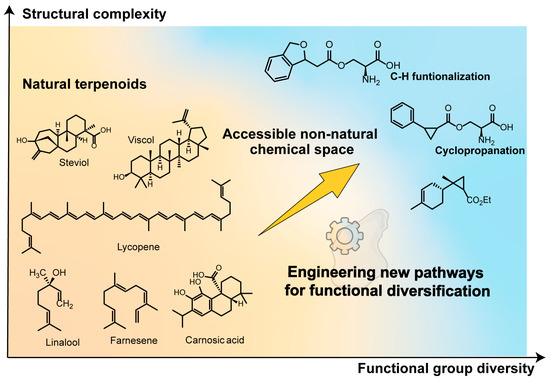 Conceptual expansion of the terpene chemical space. Natural terpenoids (left) occupy a limited region of structural complexity and functional group diversity. By integrating synthetic biology with abiotic transformations, new chemical modifications such as C–H functionalization and cyclopropanation (right) become accessible, enabling the design of non-natural terpenoids beyond the scope of nature.