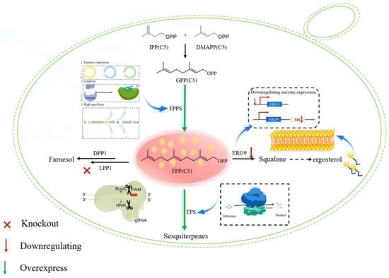 IPP and DMAPP are condensed by prenyltransferases to generate the immediate precursors for all classes of terpenes. These enzymes represent key regulatory nodes for directing metabolic flux toward specific product classes (C10, C15, C20, etc.), making them central targets for metabolic engineering. Several engineering strategies have been developed to address the prenyltransferase challenge. These include the downregulation of ERG9 to decrease flux into sterol biosynthesis, CRISPR-based editing of competing pathways to minimize metabolic drain, and the introduction of heterologous prenyltransferases with tailored chain-length specificity. In addition, fusion proteins linking prenyltransferases to terpene synthases have been designed to promote substrate channeling and reduce byproduct formation (Figure 4). Geranyl diphosphate synthase (GPPS) catalyzes the condensation of IPP with DMAPP to produce geranyl diphosphate (GPP, C10), which serves as the precursor for monoterpenes [2,41,42,43,44]. Farnesyl diphosphate synthase (FPPS) catalyzes the addition of another IPP unit to GPP, forming farnesyl diphosphate (FPP, C15), the universal precursor of sesquiterpenes, sterols, and ubiquinone. Geranylgeranyl diphosphate synthase (GGPPS) further extends FPP by incorporating an additional IPP unit to yield geranylgeranyl diphosphate (GGPP, C20), the precursor for diterpenes and carotenoids.