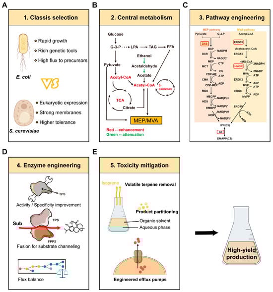 Comprehensive metabolic engineering workflow for microbial terpene production. (A) Chassis selection: Comparison of E. coli and S. cerevisiae as hosts. (B) Central metabolism optimization: Rerouting carbon flux to acetyl-CoA and balancing glycolysis and the TCA cycle. (C) Pathway engineering: modification of key MEP/MVA enzymes. (D) Enzyme engineering: Enhancing terpene synthase activity and specificity, including FPPS–TPS fusion constructs. (E) Toxicity mitigation: Strategies such as in situ product removal and efflux pump engineering (TCA, tricarboxylic acid cycle; MEP, 2-C-methyl-d-erythritol 4-phosphate pathway; MVA, mevalonate pathway; G-3-P, glyceraldehyde-3-phosphate; LPA, lysophosphatidic acid; TAG, triacylglycerol; FFA, free fatty acid; DXS, 1-deoxy-d-xylulose-5-phosphate synthase; MCT, 2-C-methyl-d-erythritol 4-phosphate cytidylyltransferase; CMK, 4-(cytidine 5′-diphospho)-2-C-methyl-d-erythritol kinase; MDS, 2-C-methyl-d-erythritol 2,4-cyclodiphosphate synthase; HDS, 4-hydroxy-3-methylbut-2-enyl diphosphate synthase; HDR, 4-hydroxy-3-methylbut-2-enyl diphosphate reductase; ERG12, mevalonate kinase; ERG8, phosphomevalonate kinase; ERG19, mevalonate diphosphate decarboxylase; ERG13, hydroxymethylglutaryl-CoA synthase; HMG1 (HMGR), hydroxymethylglutaryl-CoA reductase; IDI, isopentenyl diphosphate isomerase; IPP, isopentenyl pyrophosphate; DMAPP, dimethylallyl pyrophosphate; TPS, terpene synthase; FPPS, farnesyl pyrophosphate synthase; Sub, substrate; and β-oxidation, beta oxidation).