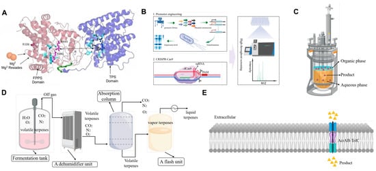 Strategies for alleviating metabolic competition and product toxicity in microbial terpene production: (A) substrate channeling via a fusion protein between farnesyl diphosphate synthase (FPPS) and a terpene synthase (TPS); (B) regulation of competitive pathways through promoter engineering or CRISPR interference (CRISPRi); (C) two-phase fermentation for in situ product removal; (D) gas stripping apparatus for volatile terpene recovery; (E) enhanced product export via native efflux pumps (FPPS, farnesyl pyrophosphate synthase; TPS, terpene synthase; sgRNA, single-guide RNA; PAM, protospacer adjacent motif; M/Z, mass-to-charge ratio; TolC, AcrA, and AcrB, components of the AcrAB–TolC efflux pump complex).