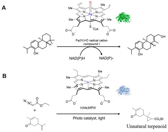 Owing to the limitations of the natural diversification systems, several innovative strategies have been devised by incorporating abiological chemistry into biology. This conceptual advance transcends the capacity of nature’s enzymes to access transformations that cannot be achieved by living systems. In this new field, Hartwig, Keasling, and their research groups have successfully shown that synthetic carbene transfer chemistry can work in living microbes for additional terpene functionalization. This strategy is particularly designed to access a new chemical space that will not be possible through traditional enzymes, to create carbon-carbon bonds through carbene insertion reactions. In the seminal work on biocatalytic carbene and nitrene transfer chemistry by Arnold and Fasan [62,63,64,65,66,67,68,69,70,71,72,73,74,75,76,77,78], cytochrome P450BM3 and myoglobin were engineered to facilitate a variety of novel transformations (Figure 8) that were not found in nature, and a replacement of cysteine ligand with serine could significantly improve the reactivity, suggesting the importance of electronic properties of haem.