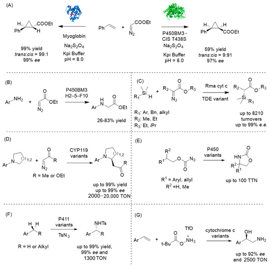 Representative examples of abiological P450 carbene and nitrene transfer catalysis: (A) cyclopropanation; (B) carbene N–H insertion; (C) carbene Si–H insertion; (D) carbene C–H insertion; (E) intramolecular nitrene C–H amination; (F) intermolecular nitrene C–H amination; (G) hydroamination.