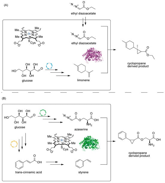The implementation of this experiment presented a microbial platform that enables de novo biosynthesis of a diazo ester carbene precursor and its application in intracellular unnatural carbene-transfer reactions. Expression of a biosynthetic gene cluster in Streptomyces albus resulted in the production of azaserine [83], an α-diazoester that served as an intracellular carbene donor. This metabolically generated reagent was employed for cyclopropanation of styrene, which was also produced intracellularly (Figure 9). The reaction was catalyzed by engineered P450 mutants utilizing native cofactors, achieving excellent diastereoselectivity and moderate yield [84]. This work establishes a foundation for integrating abiotic carbene chemistry into microbial biosynthesis pathways. Another example was the integration of artificial metalloenzymes (ArMs) that catalyze the cyclopropanation reaction with ethyl diazoacetate and limonene. Limonene was synthesized by introducing a heterologous biosynthetic pathway with phenylalanine and cinnamic acid as the key intermediates, while ethyl diazo acetate was added as a substrate [85,86]. By utilizing a transport system for iridium-based artificial cofactor, good levels of diastereoselectivity and acceptable yield were achieved, further highlighting the capability of synthetic biology and synthetic chemistry to produce molecules that were previously inaccessible to nature [87].