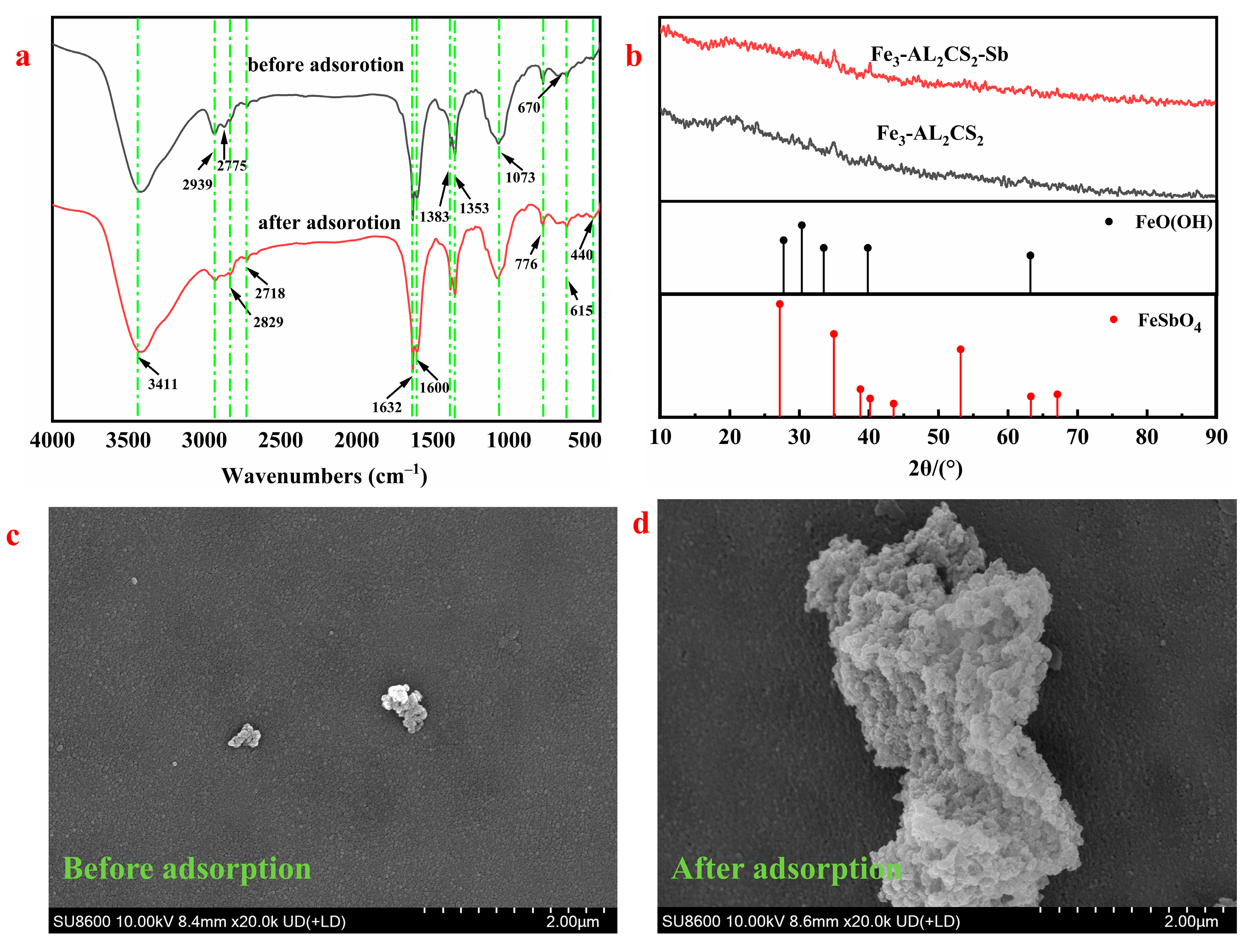 - Tang, L.; Zhang, P.; Lang, C. Synthesis, characterization and study of Sb(Ⅲ) adsorption from aqueous solution by iron-aluminum pillared attapulgite. J. Solid State Chem. 2025, 341, 125085. [Google Scholar] [CrossRef]