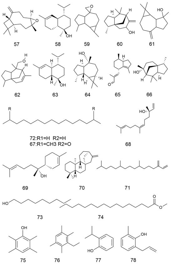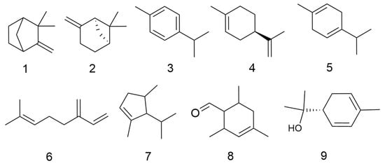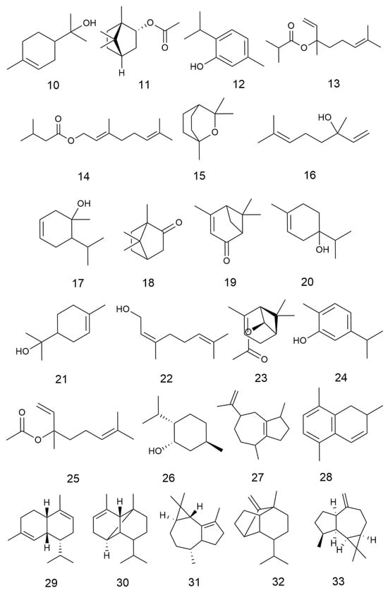 C. minima is rich in volatile oil components with anti-inflammatory, antibacterial, antitumour, asthma and antiallergic activities []. Fan Su et al. [] found that by extracting the volatile oils of C. minima and detecting them by GC-MS, the volatile oils of C. minima were mainly terpenes and esters, with the highest content of trans-chrysanthemum acetate, followed by aromatophilus, thymol, and β-stigmastanene, among others. A total of 86 volatile oil components have been identified. The specific composition is shown in Table 1. The compound structure is shown in Figure 1.