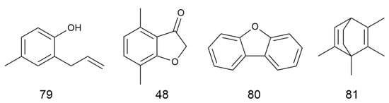Organic acid components are important chemical constituents in C. minima, and the phenolic acid components have pharmacological activities such as antioxidant, antitumour, antimicrobial, antiviral, anti-inflammatory, antidepressant, and anxiolytic [], but there are fewer studies on the activity of organic acids in C. minima. Nowadays, 30 organic acid components have been identified from C. minima. The specific composition is shown in Table 5. The compound structure is shown in Figure 5.