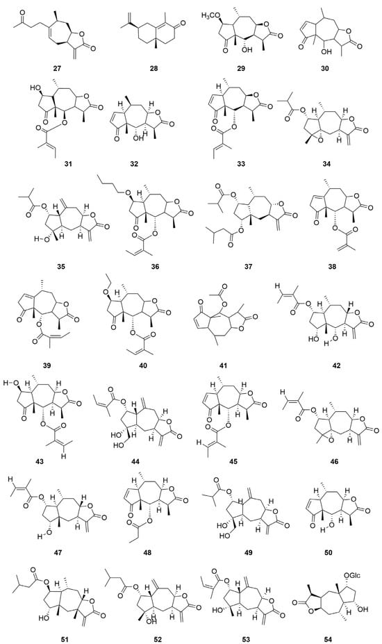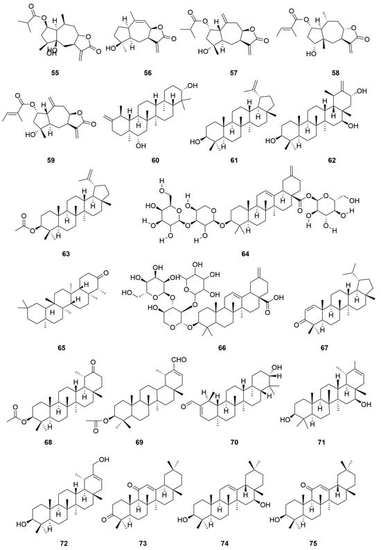 C. minima contains a large number of terpenoids, of which guaiacolane sesquiterpene lactones are the main active constituents with biological activities such as anti-tumour, anti-inflammatory, anti-viral, anti-microbial, anti-malarial, anticancer, anti-diabetic, and analgesic [], in addition to monoterpene glycosides, sesquiterpenes, and triterpene constituents, where triterpene compounds are mainly present in the form of pentacyclic triterpene saponins and their glycosides. Among these, the sesquiterpene lactones brevilin A, arnicolide D, and arnicolide C constitute the principal active constituents of C. minima. See Table 2 for details. The specific composition is shown in Table 2. The compound structure is shown in Figure 2.