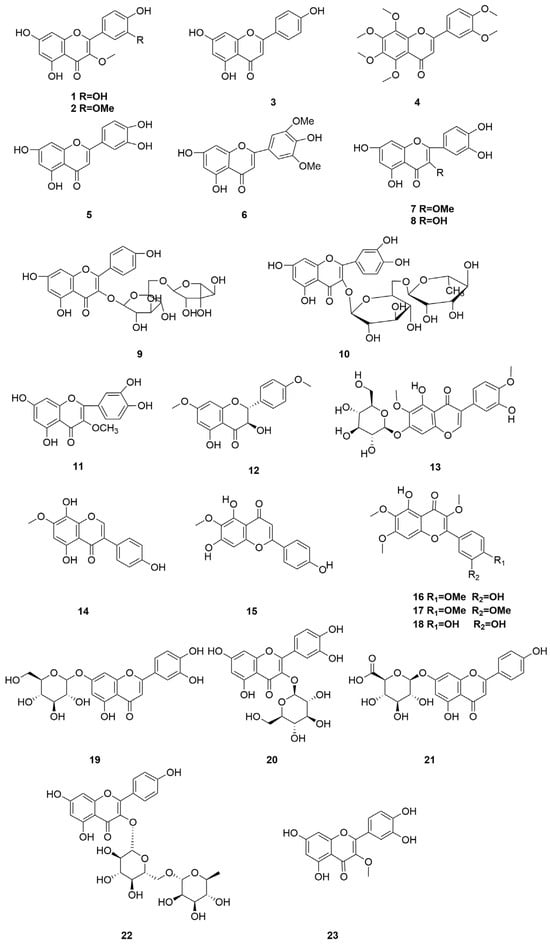 C. minima is rich in flavonoids, with significant pharmacological activity, commonly used in clinical treatment of allergic rhinitis, and the anti-allergic effect of flavonoids in goose bugloss is slightly stronger than that of volatile oil components []. The specific composition is shown in Table 3. The compound structure is shown in Figure 3.