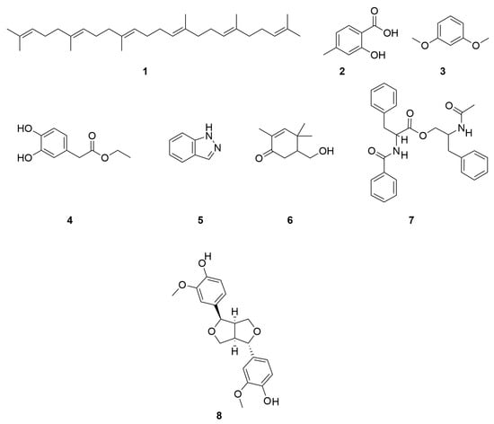 Yang Liu et al. also identified Squalene (1), 2-hydroxy-4-methy-lbenzoic acid (2), 1,3-Dimethoxybenzene (3), ethyl-2-(3,4-dihydroxyphenyl)acetate (4), 1H-Indazole (5), 5-(hydroxymethyl)-2,4,4-trimethyl-2-cyclohexen-1-one (6) and patriscabratine (7) []. In addition to the above mentioned constituents, C. minima also contains epipinoresinol (8) and other constituents []. The compound structure is shown in Figure 6.