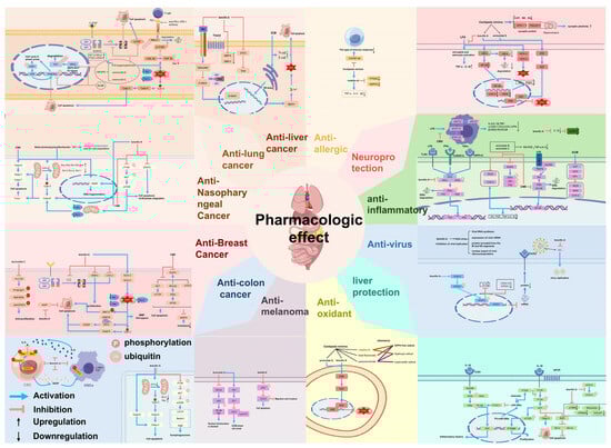C. minima is widely used in the clinic, mostly as a single medicine or in compound formulas, and is commonly used for the treatment of allergic rhinitis, whooping cough, stones, headache, malaria, and hookworm tail pass infections []. C. minima is also commonly used in combination with Magnolia, Xanthium sibiricum Patr. and Asari Radix et Rhizoma and other drugs to treat allergic rhinitis []. Various compounded formulations have been developed, such as Nasonex Nasal Drops [], Resting Cough and Anti-inflammatory Bulk [], C. minima-formulated granules [], Kelisha capsule [], and Thermo Kepin injection []. One of the allergic rhinitis nasal drops (ARND) not only inhibits viral infections and disrupts the affinity between ACE2 and the spiking protein (Delta), but also attenuates the inflammatory response after infection, which may lead to a better prognosis and lower risk of pulmonary fibrosis []. Kelisha capsule, by inhibiting the activity of the enzyme ATP synthase in Escherichia coli, reduces the ATP levels, as well as disrupting the cell wall and cell membrane of E. coli, leading to cytoplasmic leakage and bacterial death to exert its antimicrobial effect [].