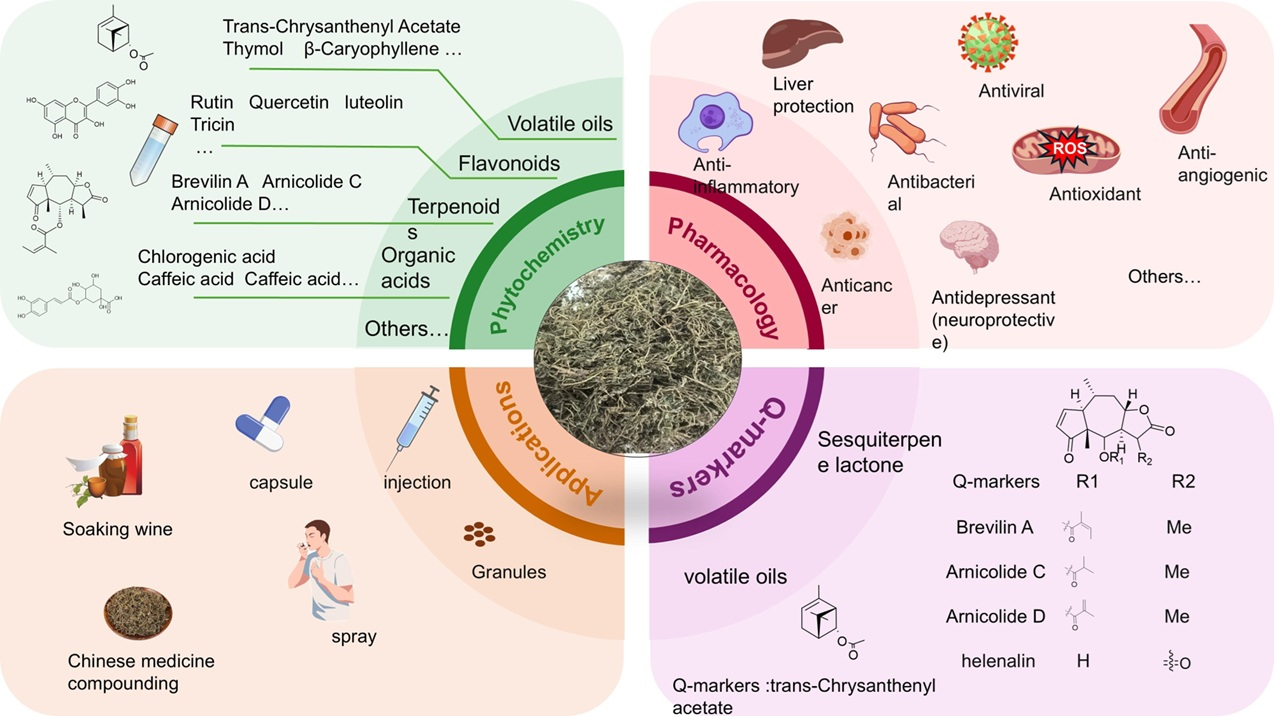 In summary, chlorogenic acid, quercetin, brevilin A, rutin, isochlorogenic acid B, isochlorogenic acid A and isochlorogenic acid C, arnicolide D, arnicolide C, minimolide F, microhelenin C, cryptochlorogenic acid, caffeic acid, nicotiflorin, 3-methoxyquercetin, chrysanthenyl acetate, and thymol may inform the Q-Marker selection of C. minima.