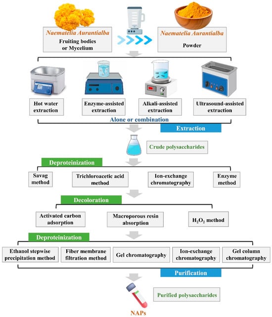 Polysaccharides are critical components of N. aurantialba, and their extraction and purification form the foundation for subsequent activity research. Prior to extraction, plants typically undergo pretreatment processes such as washing, drying, grinding, sieving, and crushing. The above steps are essential for removing colored contaminants, monosaccharides, oligosaccharides, and other small molecular substances [,]. Studies indicated that the extraction method can significantly influence the properties, structure, and functional activity of polysaccharides. Consequently, the selection of extraction methods must consider various factors, such as biological sources, target requirements, and potential interfering substances [,]. The extraction and purification technologies of NAPs are shown in Figure 2.