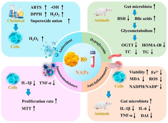 Overview of the key biological activities and mechanisms of action of NAPs exhibiting antioxidant, hypoglycemic, anti-inflammatory, and immunomodulatory activities. The upward arrow represents an increase in activity or content, while the downward arrow represents a decrease in activity or content.