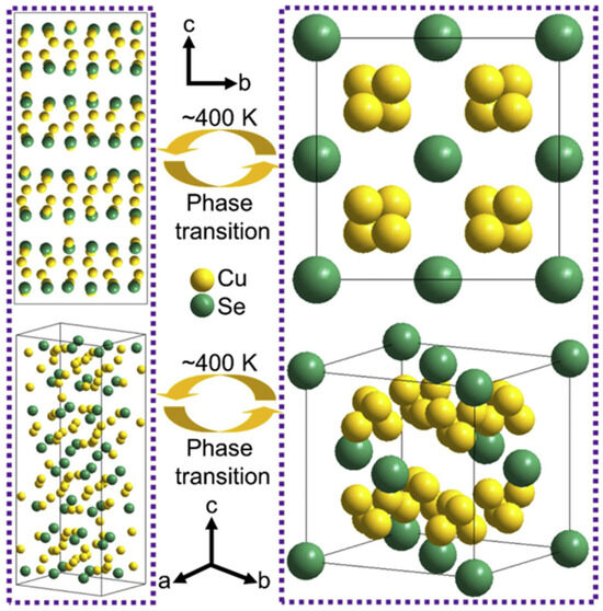 As global environmental pollution and energy shortages intensify, developing efficient and sustainable energy technologies has become a critical challenge facing humanity. The non-renewable nature of traditional fossil fuels and the greenhouse gases emitted during their use have profoundly impacted ecosystems. While clean energy sources like wind and solar power hold immense potential, their low energy density and intermittent nature limit their ability to meet continuously growing energy demands [1]. Against this backdrop, thermoelectric technology has garnered significant attention for its ability to directly convert waste heat into electricity. Among these, Cu2Se, as an emerging thermoelectric material, has emerged as an ideal alternative to traditional lead-containing materials (e.g., PbTe) due to its unique physicochemical properties and environmental friendliness. In recent years, novel thermoelectric materials like poly (3-hexylthiophene)-based materials [2], MXene-based materials [3] and graphene-based materials [4] have demonstrated broad application prospects. Research on optimizing the thermoelectric properties, interface engineering, and composite structure design of these materials provides important references for understanding the multifunctional characteristics of Cu2Se. Compared with traditional thermoelectric materials (e.g., Bi2Te3, PbTe), Cu2Se exhibits significant advantages. The structural properties of its low-temperature monoclinic phase (α-Cu2Se) and high-temperature antifluorite phase (β-Cu2Se) endow it with extremely low lattice thermal conductivity and ultra-high electrical conductivity, and the crystal structures of the low-temperature monoclinic Cu2Se and the high-temperature antifluorite-phase Cu2Se are schematically shown in Figure 1. In β-Cu2Se, the liquid-like migration behavior of Cu+ ions effectively enhances the phonon scattering, which enables the material to maintain excellent thermoelectric properties at high temperatures (up to a ZT value of 2.13 [5]), while the raw material cost is much lower than that of Bi2Te3 [6]. In addition, the narrow bandgap (~1.2 eV) and high Cu+ activity of Cu2Se enable it to perform equally well in the field of energy storage, e.g., the nitrogen-doped carbon-covered Cu2Se@NC composites retained a high capacity of 246.8 mAh g−1 in sodium-ion batteries after 2500 cycles at a current density of 10 A g−1.