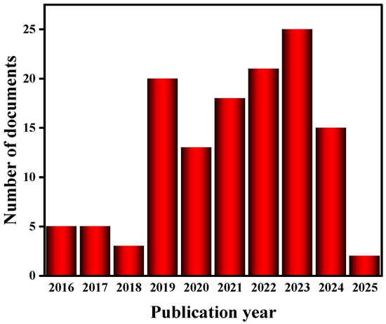 Although copper sulfide-based materials (e.g., CuS, Cu2S) have been extensively studied in the field of thermoelectricity, a systematic review of copper selenide-based materials (Cu2Se) in energy conversion and storage is still lacking. The existing literature mostly focuses on a single application scenario, e.g., Zhang et al. [10] systematically summarized the interfacial engineering strategy of copper sulfide nanomaterials in thermoelectric power generation, while Yang et al. [11] pioneered the proposal of Cu-based ternary heterostructures for asymmetric supercapacitors; their research system is still dominated by sulfides. Selenides (especially Cu2Se) are less reported, especially in the literature on supercapacitors (Web of Science statistics show that there are only 15 relevant papers), and the application of Cu2Se-based materials in energy storage is mainly focused on batteries, especially sodium-ion batteries and aqueous batteries. This manuscript provides a comprehensive and detailed analysis of Cu2Se’s applications in thermoelectric materials. It also compiles a decade’s worth of literature on Cu2Se-based batteries (Figure 2), categorizing them into sodium-ion batteries and aqueous batteries. The current situation highlights two core issues in the field: (1) the multifunctional properties of Cu2Se-based materials have not been fully explored, and the synergistic mechanism across energy conversion and storage has not been systematically analyzed; (2) the existing studies are mostly limited to a single performance optimization, and there is a lack of a whole-chain design perspective from the synthesis of materials to the integration of devices.
