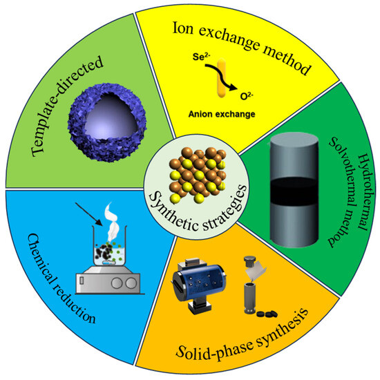 Cu2Se has been synthesized by various methods, such as pulsed laser deposition, solid-phase synthesis, hydrothermal/solvent-thermal, ion exchange, template-directed, chemical reduction, vacuum evaporation, electrochemical deposition [12], and magnetron sputtering. Figure 3 introduces the main synthesis methods of Cu2Se.
