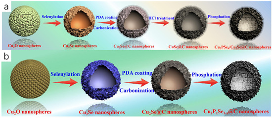 Zhao et al. [13] finally obtained carbon-encapsulated 3D hollow heterostructured Cu3PSe4/Cu2Se nanospheres (Cu3PSe4/Cu2Se@C) by a template-directed method using morphologically regular Cu2O nanospheres as templates and precursors through a series of steps: selenization, carbon-encapsulation, and phosphorylation. Firstly, Cu2O nanospheres were prepared by hydrothermal method using Cu(CH3COO)2·H2O, PVP, glucose, and dimethylformamide (DMF) as raw materials, and then selenide was performed on the Cu2O nanospheres to obtain the black-precipitated hollow Cu2Se nanospheres, and then dopamine hydrochloride was reacted with the hollow Cu2Se nanospheres to obtain the hollow Cu2Se@C nanospheres, and the hollow Cu2Se@C nanorods were immersed in hydrochloric acid solution to obtain pure CuSe@C hollow nanorods, and finally phosphorylated with sodium hypophosphite NaH2PO2 to obtain the final product of hollow Cu3PSe4/Cu2Se@C nanorods (Figure 4a). On the same principle, Zhao et al. [14] prepared hollow Cu2PxSe1−x@C nanorods through a series of steps including selenization, carbonization, and phosphorylation (Figure 4b).