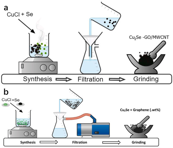 Chemical reduction is a method of obtaining the desired product by gaining or losing electrons using a chemical reagent, often through a strong reducing agent. This method is simple to operate and does not require expensive equipment or tedious steps, but because the reaction is not carried out in a vacuum-tight environment, new impurities that are difficult to remove may be introduced during the synthesis. Sankar et al. [16] prepared Cu2Se powder by using the chemical reduction method and subsequently synthesized Cu2Se-GO (graphene oxide)/MWCNT (multi-walled carbon nanotubes) nanocomposites by using the mechanical milling method. The team firstly took ethylene glycol and water mixed in a beaker as solvent according to the volume ratio of 3:7, and then added CuCl powder and Se powder according to the stoichiometric ratio of Cu2Se, and stirred them well on a magnetic stirrer, keeping the temperature of the hot plate at 100 °C. Then, NaBH4 and NaOH were added and mixed well. After the reaction was complete, the product was filtered with distilled water and ethanol solution, and then dried for 3 h at 100 °C to obtain the Cu2Se powder. Ethylene glycol can be used as a wetting agent in the reaction; in addition, NaBH4 as a reducing agent, has a strong reducing property, and high temperature can accelerate the reaction rate and promote the rapid synthesis of Cu2Se. Subsequently, the research group mixed and milled the obtained Cu2Se powder with GO/MWCNT powder, which was fully milled into round particles and then sealed in Borosil tubes. The product was then placed in the furnace with a high temperature of 600 °C sintering for 2 h and finally obtained the Cu2Se-GO/MWCNT nanocomposites, and the specific synthesis of the process flow diagram is shown in Figure 6a. The preparation of Cu2Se/graphene nanocomposites was carried out by the same group, Rapaka et al. [17], using the same method, and the process flow diagram is shown in Figure 6b. Furthermore, the working group also subsequently tested the Cu2Se-GO/MWCNT nanocomposites and the Cu2Se/graphene nanocomposites and found that both of them have excellent thermoelectric properties.