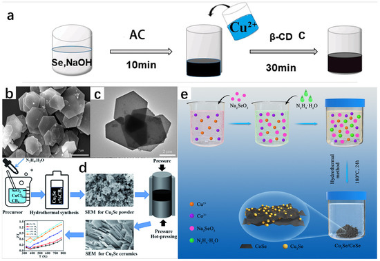 In addition to this, Zhu et al. [26] synthesized Cu2Se/CoSe composites using a hydrothermal method by placing Co(NO3)2·6H2O, Cu(NO3)2·3H2O, and distilled water in a hydrothermal autoclave and stirring well. This was followed by the addition of Na2SeO3 as a source of selenium, which was added to the autoclave and stirred well. Then, (N2H4·H2O) was added as a reducing agent, stirred well, and dried in an oven. This was followed by centrifugal washing with anhydrous ethanol and water for several times, and then freeze-dying to obtain Cu2Se/CoSe composites. The flow chart for the preparation of Cu2Se/CoSe composites is shown in Figure 8e. The chemical equations that occurred are as follows: