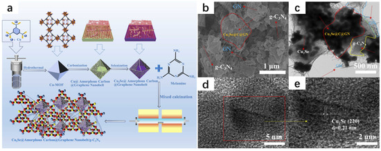 (a) Schematic of the synthesis process of Cu2Se@C@GN/g-CN. FESEM images of Cu2Se@C@GN/g-CN (b); TEM and HRTEM images of Cu2Se@C@GN/g-CN (c–e). Reproduced from ref. [32] with permission. Copyright 2024 Elsevier.