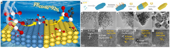 The solvothermal method is in the process of further developing the hydrothermal method, and its process as well as its principle is more or less the same; the difference is that the solvent is no longer water, but organic matter. The electrochemical reduction of CO2 is a well-established method to reduce CO2 emissions to combat environmental pollution and to convert it into usable and efficient chemical fuels [34,35,36,37]. However, due to a number of reasons, the Faraday efficiency (FE) of the CO2 reduction reaction is still low. To solve this problem, Wang et al. [38] successfully synthesized two-phase Cu2Se-SnO heterojunction catalysts on the same plane by using the hot solvent method and the high temperature thermal reduction method, which is excellent in the selection of syngas, and the Faraday efficiency (FE) once exceeded 60% at various potentials. The team first carried out the synthesis of Cu2Se hexagonal nanosheets by the hot solvent method; the specific experimental procedure was to mix Se powder with oleylamine (OLAM) and 1-dodecanethiol (DDT), with OLAM as a surfactant and DDT as a reducing agent, and by keeping it at 50 °C for a certain period of time in a vacuum until the DDT dissolves Se powder completely to obtain the brown-colored solution A, which is then cooled to room temperature and filled with nitrogen. Copper acetate monohydrate (Cu(CO2CH3)2·H2O), DDT, and OLAM were mixed, degassed, stirred, and then heated with nitrogen until CO2CH3)2·H2O was completely dissolved to obtain the yellow-orange solution B. A syringe was used to inject solution A into solution B, and it was observed that the solution rapidly changed from yellow-orange to dark green. The dark green solution was treated at 220 °C for a period of time and then cooled to room temperature, and then washed and precipitated with methanol for several times to obtain Cu2Se nanosheets, which were subsequently synthesized by a high-temperature reduction method through a series of steps to synthesize Cu2Se-SnO heterojunctions, and the specific synthesis of Cu2Se-SnO heterojunction catalysts is shown in the schematic diagram in Figure 11b. The team analyzed and compared the microscopic morphology of the Cu2Se-SnO heterojunction catalyst, Cu2Se nanosheets, and SnO nanosheets. Transmission electron microscopy showed that Cu2Se is a uniform cubic nanosheet (Figure 11c), and the morphology of Cu2Se-SnO heterojunction catalyst behaves similarly to that of Cu2Se, which is still a uniform hexagonal nanosheet (Figure 11d–f), whereas SnO nanosheets are more heavily stacked. From the high-resolution transmission electron microscopy (HR-TEM), it can be seen that the Cu2Se-SnO heterojunction catalyst contains 0.33 nm planar row spacing value with 0.26 nm lattice spacing, which corresponds to the (111) planes of the hexagonal Cu2Se and the (110) planes of SnO, respectively, which successfully proves the synthesis of Cu2Se-SnO heterojunction catalyst; and this point is of course evident from the XRD spectrum which can also be illustrated. Among them, Cu2Se-SnO0.04 has a larger contact surface between Cu2Se and SnO, indicating that it has more heterojunction interfaces, and it is not difficult to see that Cu2Se-SnO0.04 has a 2D nanosheet structure in the EDX diagram. The team subsequently conducted a series of electrochemical tests, and the results showed that the Cu2Se-SnO0.04 catalyst had the best stability and selectivity in synthesis gas, and its unique 2D nanosheet structure led to a much higher rate of charge transfer, and more heterojunction interfaces led to a substantial enhancement of the charge distribution on the surface of the catalyst, which greatly improved the Faraday efficiency (FE), which reaches an amazing 92% at −0.97 V vs. RHE.