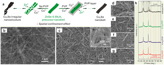 (a) Effect of the absence or presence of PVP on the synthesizer. (b) SEM images of ZnSe-0.5N2H4 nanoribbons. (c) SEM images of Cu2Se. (d–g) SEM images of PVP generators with the addition of 0 g, 0.2 g, 0.4 g, and 0.6 g. (h) XRD spectrum of PVP generators with the addition of 0 g, 0.2 g, 0.4 g, and 0.6 g. Reproduced from ref. [43] with permission. Copyright 2018 American Chemical Society.