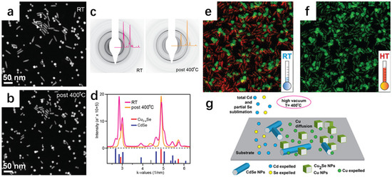 (a,b) SEM images of Cu2Se and CdSe NCs at room temperature versus 400 °C. (c) Electron diffractograms of Cu2Se nanorods and CdSe nanorods after heat treatment at room temperature and 400 °C superimposed on 1D profiles of ED signals obtained by integrating and by rounding off the angle in mutual inverse space. (d) Integrated linear spectrum of ED modes collected before 400 °C treatment and after 400 °C treatment. (e) Normalized energy-filtered TEM map obtained at RT. (f) Normalized energy-filtered TEM map obtained at 400 °C. (g) Schematic Diagram of Ion Exchange. Reproduced from ref. [44] with permission. Copyright 2016 American Chemical Society.