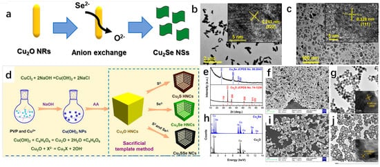 Figure 15a shows the schematic diagram of Se2− ion exchange with O2− ion, which can briefly describe the synthesis process of Cu2Se nanorods. Figure 15b,c show the TEM images of Cu2O and Cu2Se, respectively, and it can be seen that the morphology of Cu2O is a rod with uniform size, while the morphology of Cu2Se is a denser flake. Similarly, Wang et al. [63] successfully synthesized Cu2Se hollow nanocubes (HNCs) by the anion exchange method using Cu2O nanocubes (NCs) as templates, and by changing the type of reactants. This method can also synthesize Cu2S HNCs or Cu2SSe NCs with similar structures. The schematic diagram of their synthesis is shown in Figure 15d, in which PVP acts as a capping agent and AA is ascorbic acid. It is easy to see that the morphology of the synthesized product without PVP will be heterogeneous morphology; X2− ion is S2− ion or Se2− ion or S2− and Se2− ion, and the synthesized product is different according to the X2−. Figure 15e shows the XRD spectrum, which proves that Cu2O was successfully synthesized and converted to Cu2Se, and the purity of the synthesized Cu2Se is relatively high. According to the general conclusion in the literature, the reaction proceeds in the direction from the substance with large Ksp to the substance with small Ksp. These two works not only successfully synthesized Cu2Se but also conveyed a message that the Ksp of Cu2Se is lower than that of Cu2O.