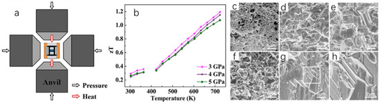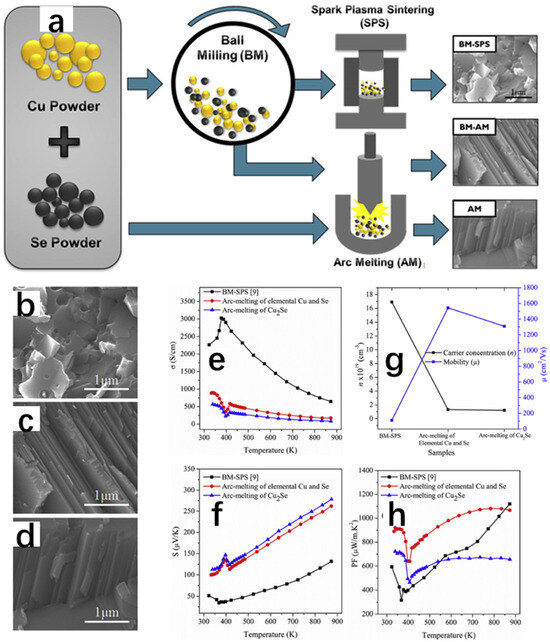 The mechanical alloying–sintering method is often accompanied by high temperature and high pressure conditions, which is generally divided into the following steps: firstly, the reactants are weighed, mixed, and grounded according to a certain ratio, and secondly, the mixture is heated and pressurized in the equipment to produce a solid-phase reaction, and then the product is milled to obtain ultrafine powder (Figure 7a). In order to facilitate testing or to improve the properties of the synthesized powders, this is often accompanied by pressing the synthesized powders into flakes and subsequently sintering the samples. The melting method generally uses the raw material powder as a precursor in accordance with a certain reaction ratio in a quartz glass tube, and passes into the protective gas. The role of the protective gas is to prevent the raw materials in the reaction process and the air in the reaction of the material to produce impurities. Then, the subsequent control of the reaction temperature in the vacuum-sealed heating furnace creates the melting reaction of the raw material powder. The arc melting method, as a type of melting method, generally consists of the following operating steps. The raw material powder is first placed in a mold of the same shape as the pre-made sample and a certain amount of pressure is applied in order to compact the powder and obtain a block sample of a certain shape. This generates an arc between the electrodes or between the melted material and the electrodes to generate heat to melt the metal; the power supply is then cut off to cool to obtain a block sample. The arc melting method is easy to operate and does not require expensive equipment, complex processes, or long reaction times. It also does not require any subsequent sintering, which has attracted much attention compared to the higher temperatures required for the sintering of Cu2Se prepared by SPS and HP. In recent years, there are many examples of Cu2Se synthesized by solid-phase synthesis. For example, Sun et al. [18] used a mechanical pulverization method to directly grind and tablet purchased Cu2Se powders. They subsequently obtained high-density Cu2Se bulk materials with excellent thermoelectric properties by sintering them under high pressure in an atmosphere of hydrogen or nitrogen, and N2 densified the surface of Cu2Se (Figure 7e). Mac et al. [19] prepared Cu2Se with excellent thermoelectric properties by a mechanical alloying–sintering method. The Cu and Se powders were weighed and loaded into a high-energy ball mill at 700 rpm for 10 h according to the stoichiometric ratio of Cu2Se. The powders were subsequently pressed at 523 K and later removed and sintered at different temperatures to obtain a series of Cu2Se bulk samples. In addition, Salam [20] et al. successfully synthesized the Cu2Se thermoelectric material with excellent thermoelectric properties by using the arc melting method, reaching a ZT value of 1.46 at 873 K.