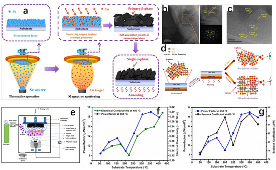 - Rapaka, S.S.; Anwar, S.; Anwar, S. Optimizing Thermoelectric Power Factor in Magnetron Sputtered Cu2Se Thin Films by Varying Substrate Temperature and Synergy of Cu/Se Ratio. Ceram. Int. 2024, 50, 15879–15887. [Google Scholar] [CrossRef]