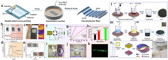 - Zhang, D.; Li, L.; Zhang, X.; Guan, L.; Jin, S.; Jia, J.; Wen, J.; Zeng, W. In Situ Synthesized Staggered-Layer-Boosted Flexible Ag2Se and Cu2Se Thin Films for Wearable Thermoelectric Power Generators. Adv. Funct. Mater. 2025, 35, 2419392. [Google Scholar] [CrossRef]