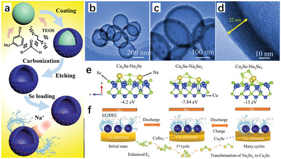 - Meng, W.; Dang, Z.; Li, D.; Jiang, L.; Fang, D. Efficient Sodium Storage in Selenium Electrodes Achieved by Selenium Doping and Copper Current Collector Induced Displacement Redox Mechanisms. Adv. Funct. Mater. 2022, 32, 2204364. [Google Scholar] [CrossRef]