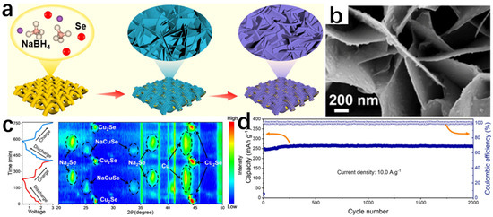 - Yue, L.; Wang, D.; Wu, Z.; Zhao, W.; Ren, Y.; Zhang, L.; Zhong, B.; Li, N.; Tang, B.; Liu, Q.; et al. Polyrrole-Encapsulated Cu2Se Nanosheets in Situ Grown on Cu Mesh for High Stability Sodium-Ion Battery Anode. Chem. Eng. J. 2022, 433, 134477. [Google Scholar] [CrossRef]