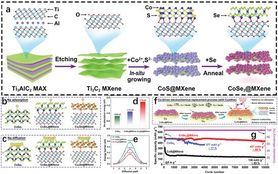 - Lu, C.; Li, B.; Shi, M.; Li, Q.; Liu, K.; Lu, C.; Liao, J.; Hu, Z.; Wei, X.; Li, C.; et al. Cu-Driven Active Cu2Se@MXene Heterointerface Reconstruction and Co Electron Reservoir Toward Superior Sodium Storage. Adv. Energy Mater. 2025, 15, 2405706. [Google Scholar] [CrossRef]