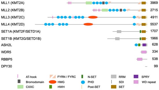 Domain organization of human subunits of KMT2 complexes. Shown are the six catalytic subunits (MLL5/KMT2E is not shown as thus far no catalytic activity has been reported for this KMT2 member), and the four core subunits that form the WRAD complex, which is associated with and necessary for the catalytic activity of all six KMT2 subunits. AT-hooks, adenosine-thymidine-hook; CXXC, Zinc finger-CXXC domain; FYRN/C, phenylalanine and tyrosine rich region (N- and C-terminal); HMG, high mobility group; HWH, helix-wing-helix domain; N-SET, N-terminal of SET; PHD, plant homeodomain; Post-SET, C-terminal of SET; RRM RNA recognition motive; SDI, Sdc1-Dpy-30 interaction; SET, Su(var)3-9, Enhancer-of-zeste and Trithorax; SPRY, spla and the ryanodine receptor domain; WD repeat, tryptophan-aspartic acid repeat. The numbers on the right indicate amino acids of human proteins. The information regarding domains is retrieved from https://www.ncbi.nlm.nih.gov/protein/ (accessed on 18 August 2025).