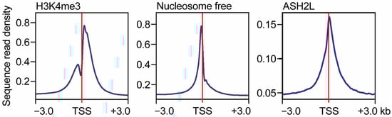 Pattern of histone H3 lysine 4 methylation at promoters. Summary of ChIP-seq experiments performed with antibodies selective for H3K4me3 from cross-linked chromatin obtained from murine embryo fibroblasts (left panel). Parallel ATAC-seq experiments were used to determine nucleosome-free or -depleted regions (middle panel). ChIP-seq experiments were carried out with antibodies selective for the ASH2L core subunit of KMT2 complexes (right panel). The region around transcriptional start sites is shown (TSS ± 3 kb). The data is taken from [].