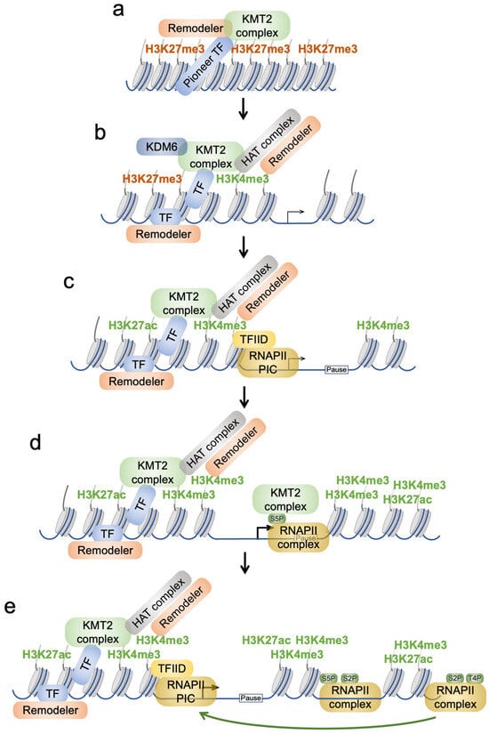Model of the role of H3K4 methylation in promoting gene transcription. (a) A silenced region of chromatin with H3K27me3 is shown. Pioneering TFs are capable of binding to little accessible chromatin and promote chromatin opening. This is achieved by the recruitment of cofactors, such as chromatin remodeling and KMT2 complexes. (b) A consequence is chromatin opening, which allows for the binding of additional TFs. KMT2 complexes can interact with KDM6 enzymes that can demethylate H3K27me3 and thus make acetylation possible via histone acetyltransferases (HATs). These can be recruited by both sequence-specific TFs and KMT2 complexes. (c) This results in demethylation of H3K27, tri-methylation of H3K4, and acetylation of H3K27, as well as other lysines (not shown). Together with chromatin remodelers, the chromatin at core promoters is becoming accessible. This is thought to result in a nucleosome-depleted region that provides sufficient space for RNAPII pre-initiation complex recruitment and binding. This is favored by the ability of the TFIID complex, a subcomplex of the PIC, to read H3K4me3 through its TAF3 subunit. (d) Upon phosphorylation of serine 5 (S5P) of the C-terminal domain of RNAPII, the polymerase complex can translocate to the transcriptional pause site. S5P may be affected by KMT2 complexes. Moreover, this promotes binding of KMT2 complexes to RNAPII. This localization is further aided by the ability of KMT2 complexes to bind to unmethylated CpG dinucleotides, which are particularly abundant in CpG island promoters (the majority of human and murine promoters possess CGIs). Overall, this leads to further H3K4me3 and H3K27ac as well as other modifications. (e) Further progression from the pause site of the RNAPII complex is dependent on S2P. Termination of transcription is characterized by S2P and T4P of the CTD. The high levels of H3K4me3 in the promoter proximal regions is thought to promote reinitiation of gene transcription, which requires changes in the RNAPII modification pattern, a process that is only partially understood. Together, this model suggests that KMT2 complexes and H3K4me3 play key roles in chromatin remodeling and opening, recruitment of writers and erasers, RNAPII complex recruitment, and reinitiation of transcription. Not all the histone marks, proteins, and interactions are shown, which are discussed in the text, for clarity. The focus here is on promoters. We imagine that the opening of chromatin at enhancers may also be driven by pioneering TFs and the recruitment of chromatin remodelers and KMT2 complexes.