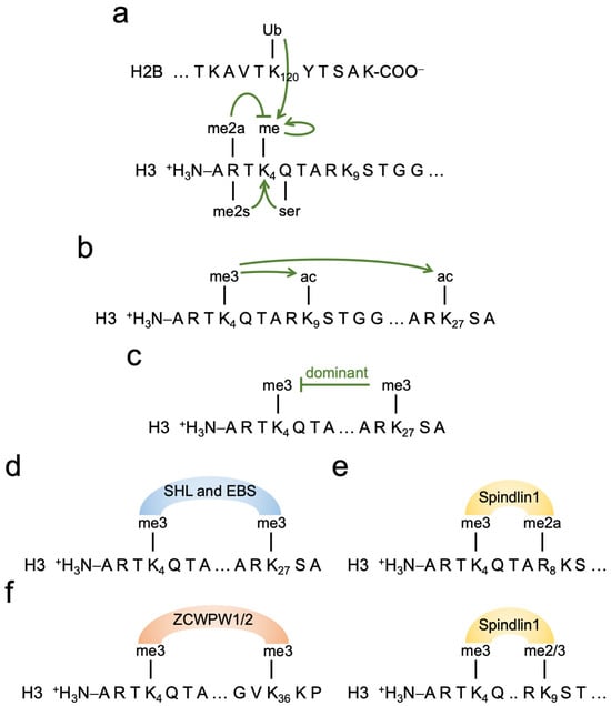 The asymmetric di-methylation of histone H3 arginine 2 (H3R2me2a) interferes with H3K4 methylation in cis (Figure 5a) [,,]. In cells, the loss of H3R2me2a promotes KMT2 complex binding and gene expression []. In contrast, the symmetric H3R2me2s is associated with H3K4me3 at active promoters as well as at sites of recombination []. Moreover, the combination of H3K4me3 with either R8me2a or K9me3/2 is read by Spindlin1, stimulating the transcription of rRNA genes (Figure 5e) [,,,]. These examples document the interplay of H3K4 methylation with other histone marks. Further complexity can be envisaged when more than two histone marks are considered, including marks that so far have not been studied in detail.