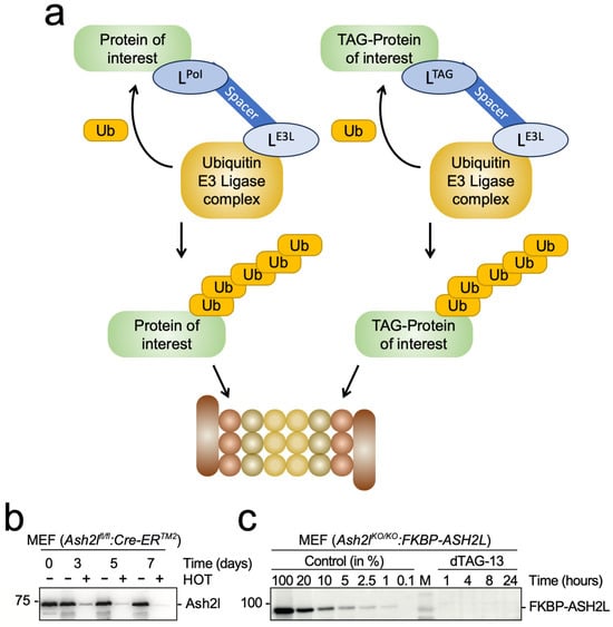 Proteolysis targeting chimera (PROTAC) for the rapid degradation of proteins of interest (PoIs). (a) Schematic of PROTAC systems. Ligands (L) are used to interact either directly with a protein of interest (LPoI, left panel) or target a tagged version of the PoI (LTAG, right panel). Optimally, this results in the poly-ubiquitination of the PoI and its subsequent proteasomal degradation. (b) Ash2l expression is shown in mouse embryo cells (MEF) with a floxed Ash2l locus. Upon deletion of the Ash2l loci in response to 4-hydroxytamoxifen (HOT) treatment, protein expression is measured over several days. The data are taken from []. (c) MEF cells with deleted Ash2l loci express a FKBP-ASH2L fusion protein. Upon adding the bi-functional PROTAC dTAG-13, which binds to both FKBP and the Cereblon subunit of a Ubiquitin E3 ligase complex, FKBP-ASH2L is poly-ubiquitinated and degraded in the proteasome. The data are taken from [].