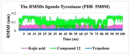 Protein–ligand RMSDs for kojic acid, Tropolone and compound 12.