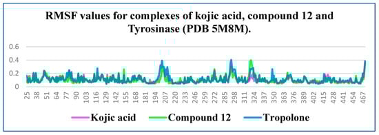 The calculated average RMSF for tyrosinase with kojic acid, tropolone and compound 12.
