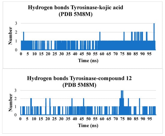 The number of hydrogen bonds during the simulation for complexes of tyrosinase with kojic acid, tropolone and compound 12.