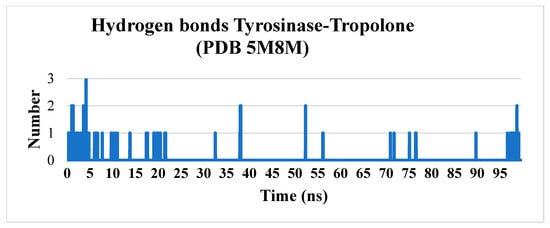 Kojic acid and compound 12 form hydrogen bonds with the protein, but kojic acid maintains a more stable number of hydrogen bonds throughout the simulation. Compound 12 forms, on average, one to two hydrogen bonds, with intermittent periods where no hydrogen bonds are observed. Tropolone, owing to its simple single-phenyl core scaffold, typically does not form hydrogen bonds but occasionally forms one to three hydrogen bonds (Figure 6).