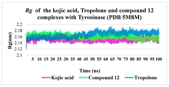 The radius of gyration (Rg) quantitatively measures the compactness or spatial distribution of a molecule’s atoms relative to its center of mass. Consequently, the trajectory analysis of Rg reflects changes in the overall dimensions of the protein throughout the molecular dynamics simulation. The average Rg value for the kojic acid–tyrosinase complex was 2.15 nm, while the complex with compound 12 exhibited a slightly higher value (2.16–2.17 nm). Similarly, the tropolone–tyrosinase complex demonstrated comparable stability, with slightly elevated Rg values from 50 ns onward. Ultimately, all three complexes remained stable over the 100 ns simulation period, indicating comparable compactness and stability under the given simulation conditions (Figure 7).