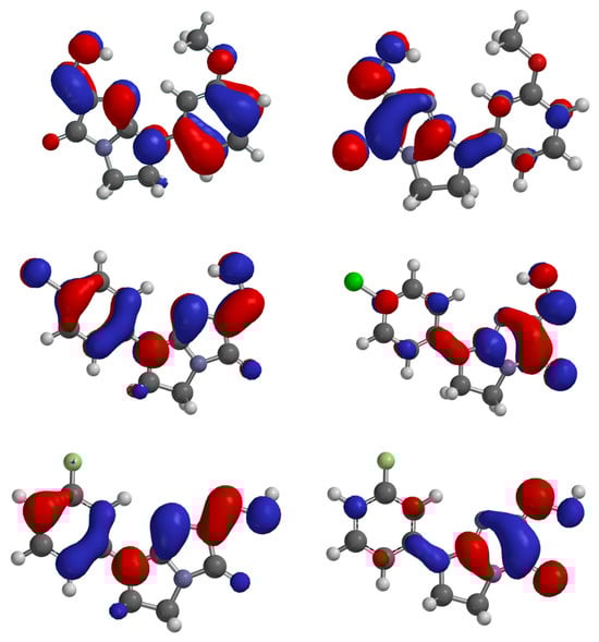 The calculated HOMO–LUMO energy gap, together with the derived reactivity descriptors, provides insight into the potential bioactivity of the proposed compounds. HOMO level reflects the electron-donating capacity of the molecule, which is critical for coordinating with the metal center, while LUMO indicates the ability to accept electrons from the enzymatic environment (Figure 8). A moderate HOMO–LUMO gap facilitates these interactions, potentially enhancing inhibitory potency.