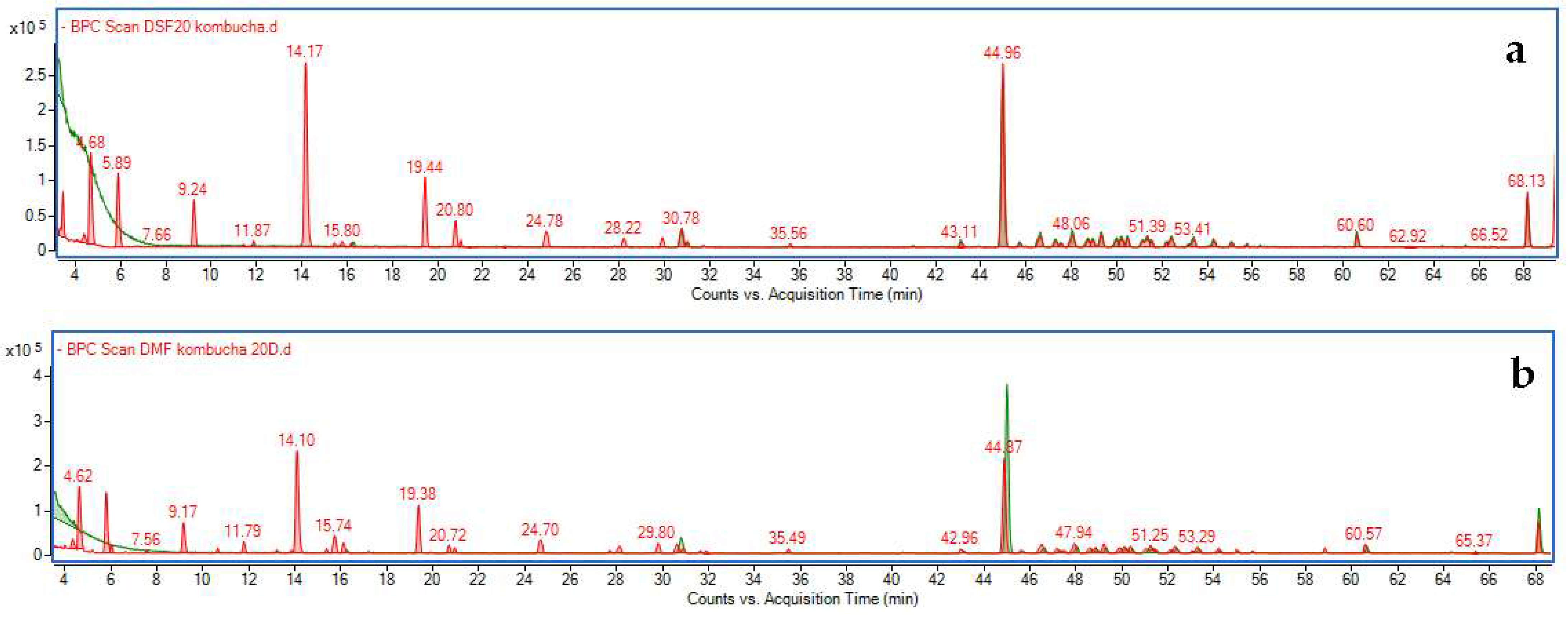 Table S1 (Supplementary Material) summarizes the mass data for the main peaks observed in the chromatograms. Examples of base peak chromatograms showing the overlaid traces for fermented and unfermented extracts from pumpkin skin and pulp are presented in